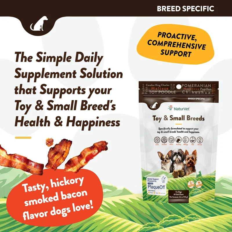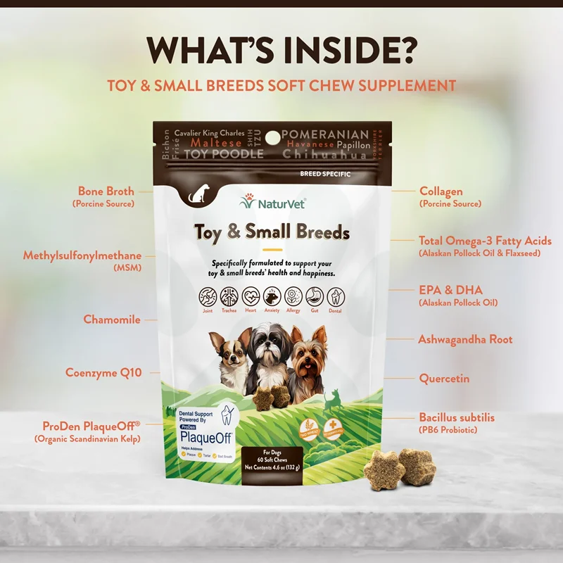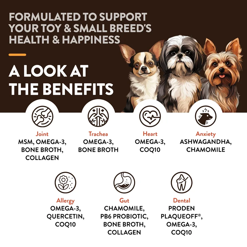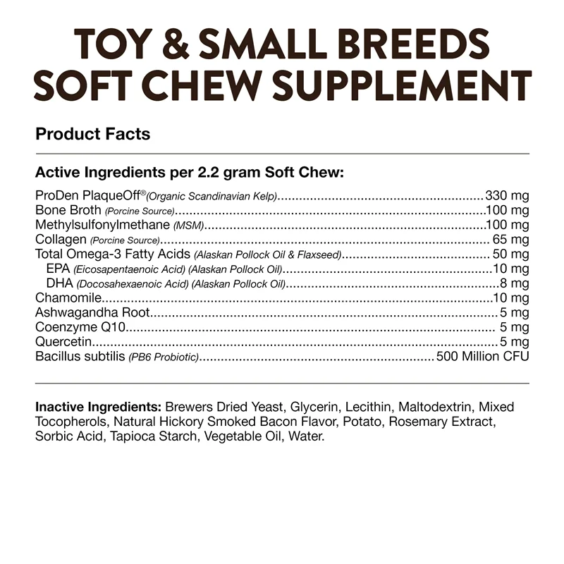 مکمل اختصاصی سگ های توی و کوچک نیچروت، با ترکیبی سالم از عصاره استخوان، MSM، کلاژن، اسیدهای چرب امگا 3، بابونه، آشواگاندا، کوآنزیم Q10، کوئرستین، باسیلوس سوبتیلیس PB6 پروبیوتیک و ProDen PlaqueOff® که به طور هم افزایی برای مقابله با چالشهای سلامتی خاص کار میکنند، فرموله شده است. سگ های نژاد کوچک سگ های خوش طعم با طعم بیکن دودی هیکوری را دوست دارند!