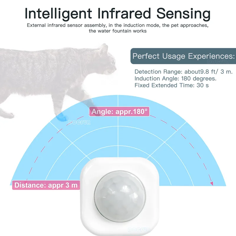 این سنسور حرکتی دارای قابلیت دید ۱۸۰ درجه تا فاصله ۳ متری با حساسیت بالا که با نزدیک شدن پت های دلبندتان به آبخوری فعال شده و با رفتن آنها ۱۵ ثانیه بعد متوقف می شود.