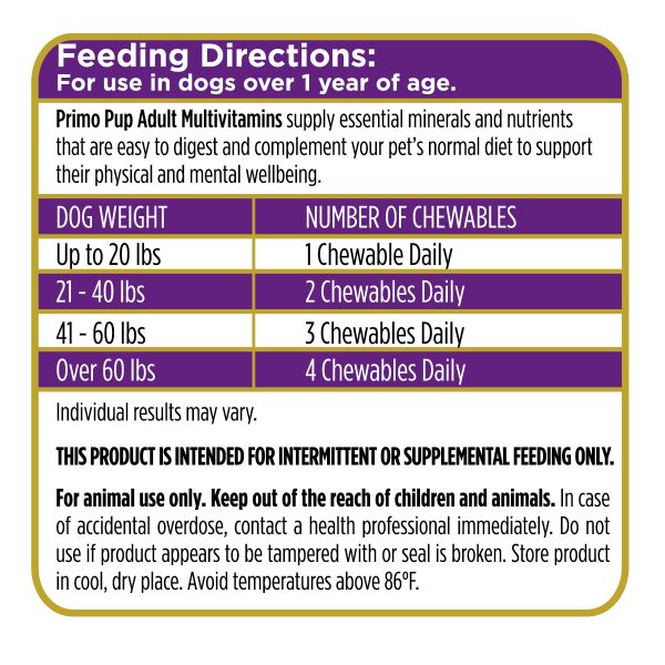 Primo Pup Adult Multi یک مکمل مولتی ویتامین جویدنی برای سگهای بالغ است که توسط دامپزشکان طراحی شده و در آمریکا تولید میشود.