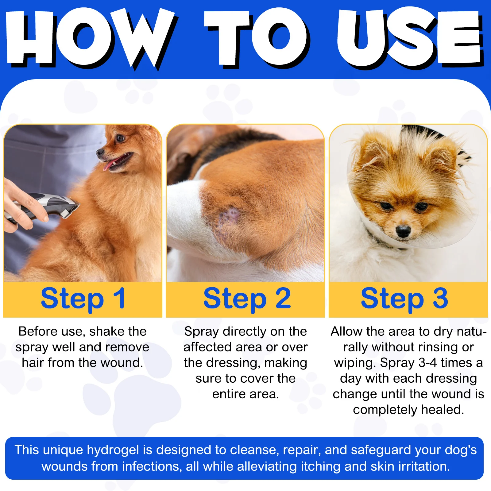 - محافظت طولانیمدت: این اسپری و هیدروژل علاوه بر درمان سریع، یک لایه محافظ بر روی پوست آسیبدیده ایجاد میکند که از عفونت و آسیب بیشتر به زخمها جلوگیری میکند. این ویژگی باعث میشود که در طول روند درمان، پوست حیوان خانگی شما از آسیبهای احتمالی محافظت شود.