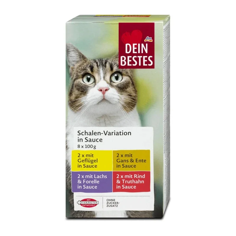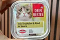 ووم کاسه ای برند محبوب دین بست Dein Bestes با تکه های لذیذ بوقلمون و گوساله طعم دار شده در سس بسیار خوشمزه خامه, طعمی خاص و لذت بخش برای گربه های شما.