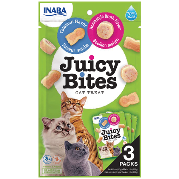 تشویقی juicy bites برند محبوب اینابا دارای بافتی تر و نرم و لذیذ و آبدار می باشد که طعم و خوشمزگی را برای گربه های دلبندتان دو چندان کرده و گربه ها را عاشق خود می کند.